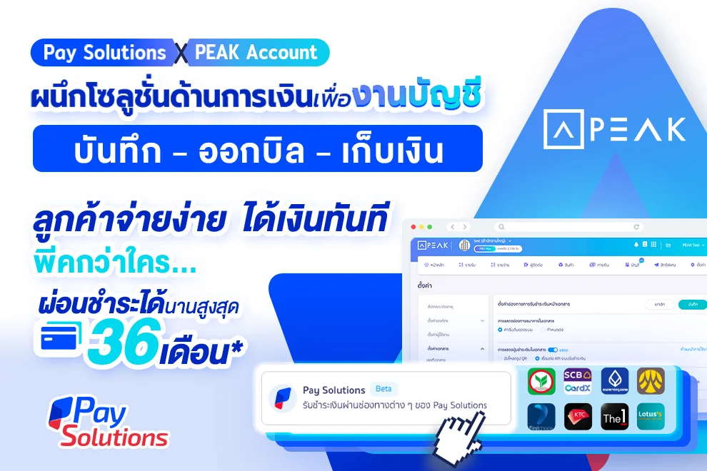 Pay Solutions ระบบชำระเงินออนไลน์ครบวงจร ร่วมกับ PEAK Account โปรแกรมบัญชีออนไลน์ จับมือผนึกโซลูชั่นด้านงานบัญชี เพิ่มฟังก์ชั่น บันทึก – ออกบิล – เก็บเงิน ตอบโจทย์สำหรับผู้ประกอบการยุคดิจิทัล เน้นจัดการงานเอกสารได้สะดวก ตรวจสอบธุรกรรมได้รวดเร็ว